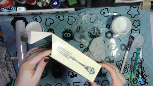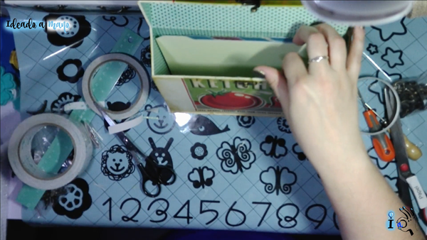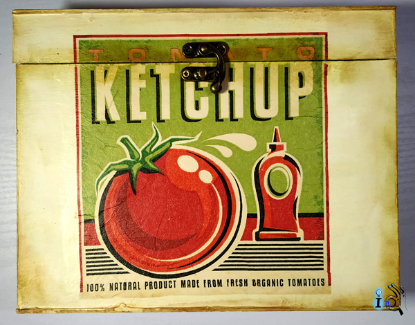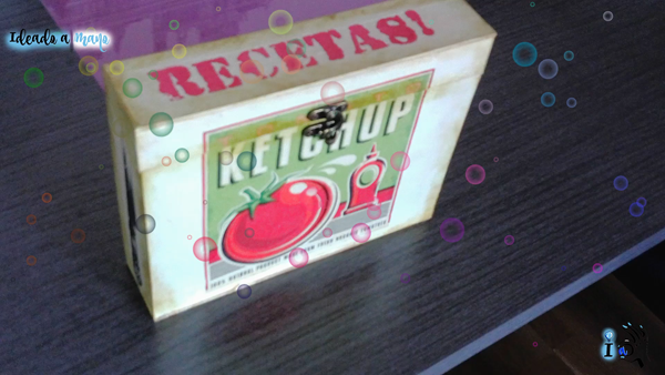 Luego pinto la parte de fuera con pintura a la tiza, dos manos, y le hago un decoupage con esta servilleta de Ketchup tan chula. Para hacer el decoupage mantenemos la caja cerrada con un par de cintas de carrocero y luego cortamos la servilleta por la apertura de la caja para pegar bien la servilleta en esta zona.