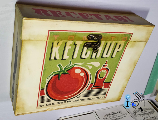 Cuándo ha secado el decoupage hago en la parte superior un stencil que dice RECETAS! en color rojo cereza, que creo que combina muy bien con la servilleta frontal.