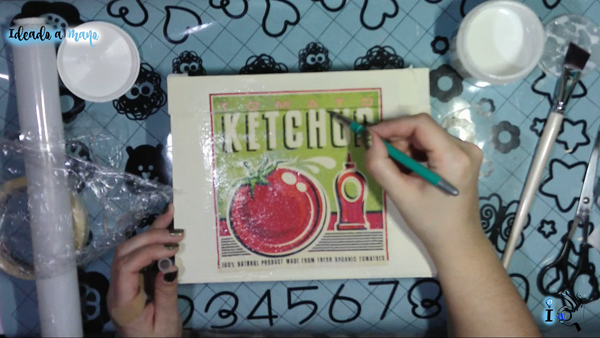 También hago decoupage en los laterales con un tenedor y un cuchillo que recorto de otra servilleta, y en la parte de detrás pego otra de Ketchup.