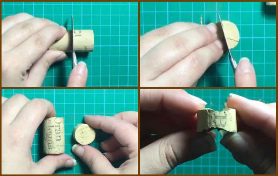 Las patas: Comienza cortando un corcho en cuatro partes: primero por la mitad y luego divídelas en dos semicírculos. ¡Mira las dos primeras fotos!
