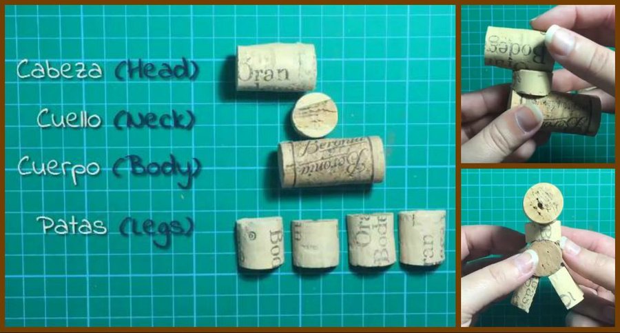Usa un corcho entero para hacer el cuerpo y pega las patitas. Después añade el cuello y la cabeza.
