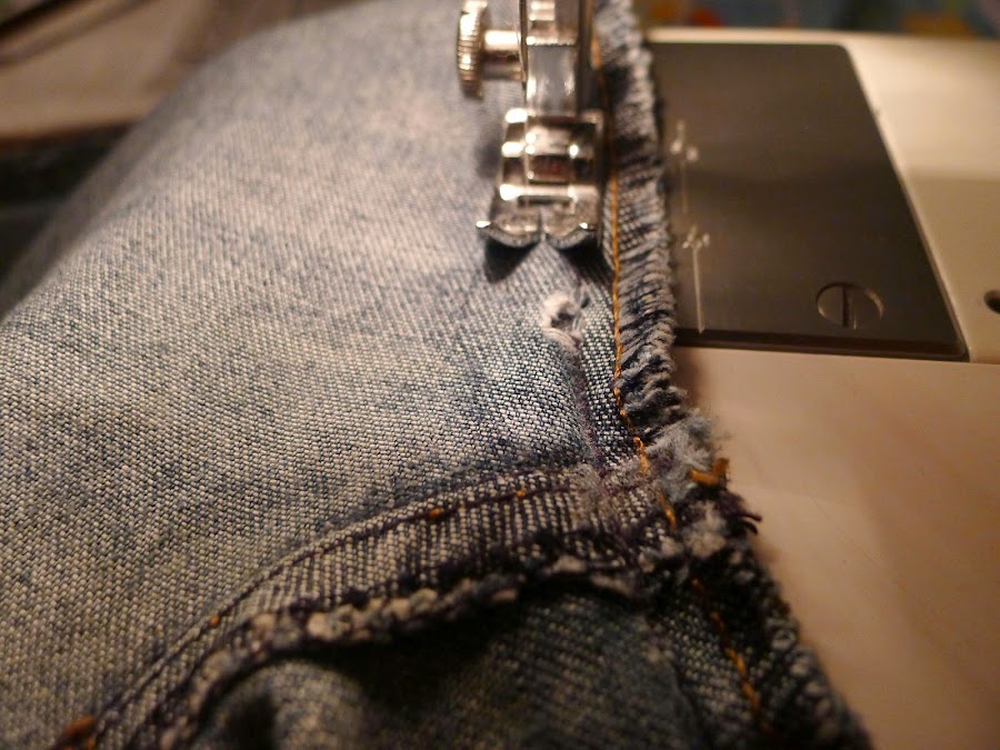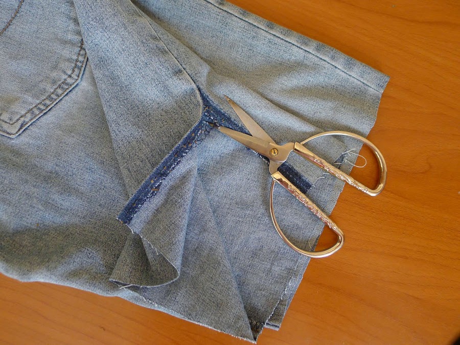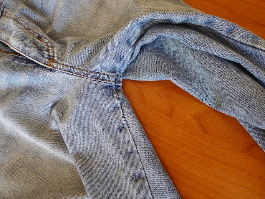 En mi caso, los vaqueros estaban desgastados de entrepierna y por esta razón he tenido que coser un poco más adentro la costura del tiro y para dar la anchura perdida de esa zona, he cortado una pieza en forma de cuña a los laterales y la he cosido a partir de los bolsillos del anterior modelo.