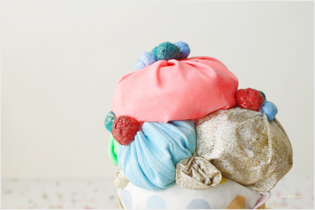 # Paso 6. Monta la tarta sobre la base pegando las distintas capas entre sí con la silicona caliente o el pegamento instantáneo. Disimula los cosidos con las bolitas de algodón: