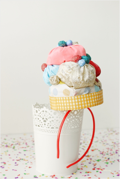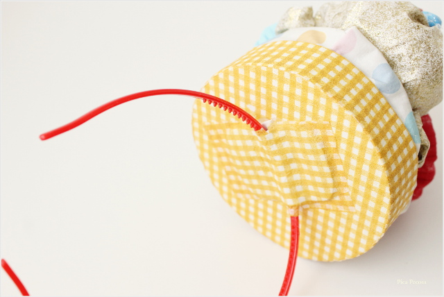 # Paso 7 (y último). Pega la tarta a la diadema con un rectángulo de goma eva y tápalo con un trozo la misma servilleta:
