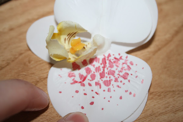 Ahora maquillamos nuestra orquídea. Primero la pintamos como si tuviera pequeñas manchas y después le echamos polvos de ojos para sombrearla.