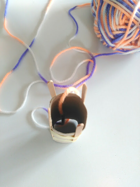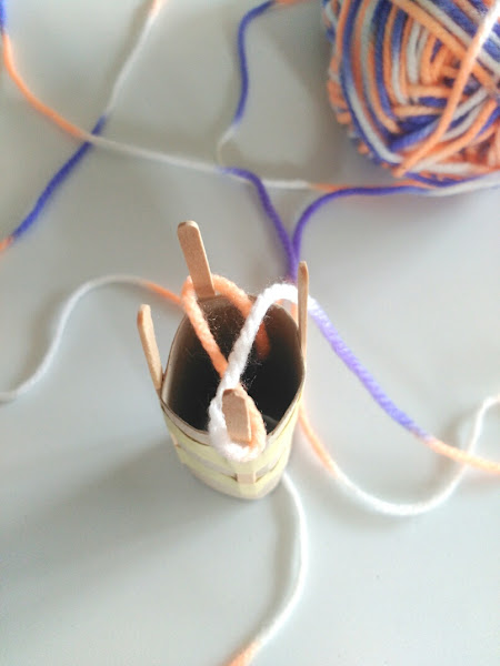 Con los dedos pasamos todas las hebras por encima de los palos de helado. Continuaremos haciendo todas las vueltas de la misma forma...rodeamos los palos con la hebra y pasamos la hebra por encima de los palos...la lana tricotada irá saliendo por el centro del tubo...