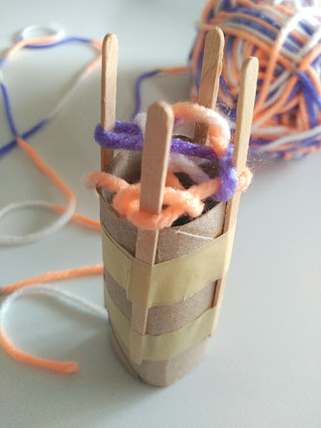 Lo ponemos de pie y metemos la hebra de lana por dentro del tubo. Tiene que salir por el otro lado ;)