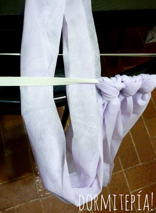 -Ahora la parte divertida: Tomar una tira de tela y doblarla a la mitad. Pasar la parte doblada dentro del elástico: