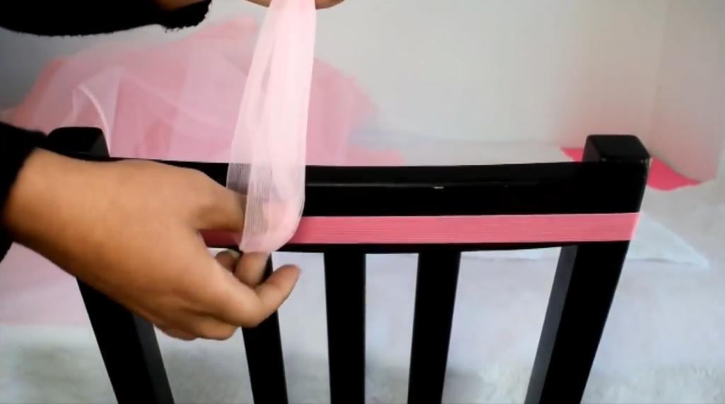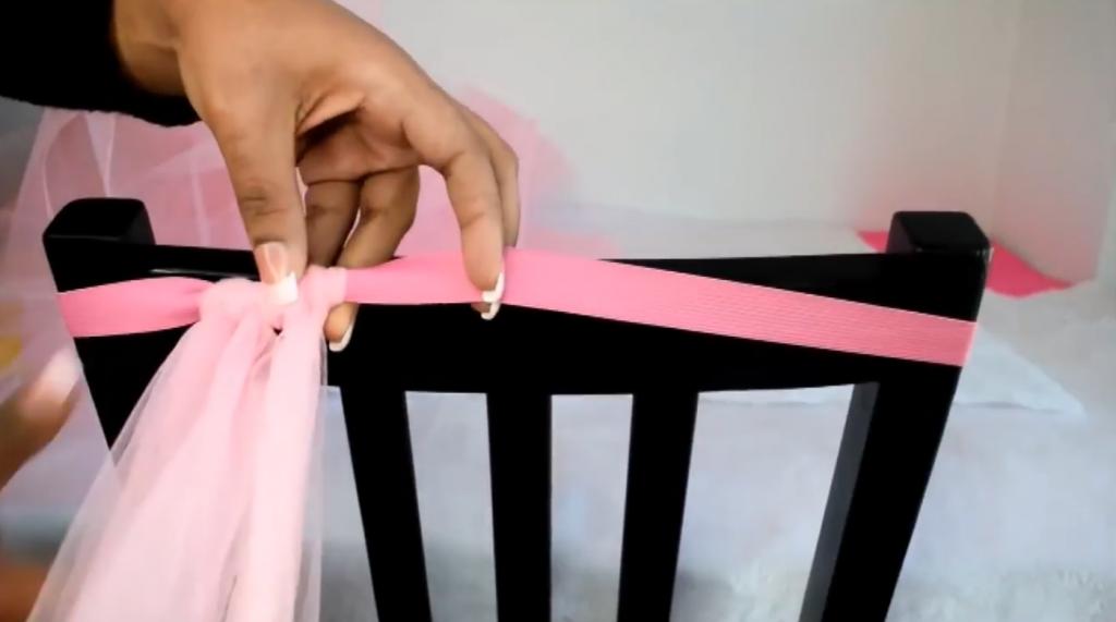 Vamos a colocar la tira de tul en el elástico introduciendo los extremos separados por el centro y jalamos para que quede ajustado en el elástico.