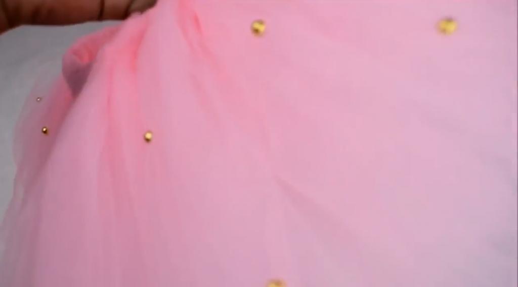 Lo primero que tenemos que tenemos que hacer es colocar la tela tul sobre una superficie plana, la doblamos y lo siguiente que vamos a hacer es recortar tiras de 46 cm de ancho aproximadamente con el largo que desees.