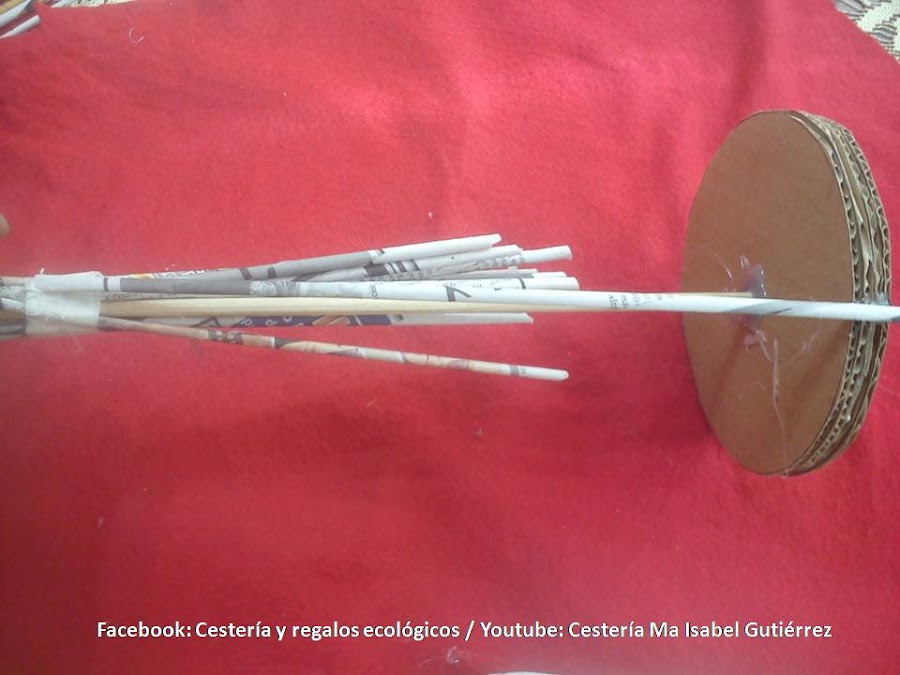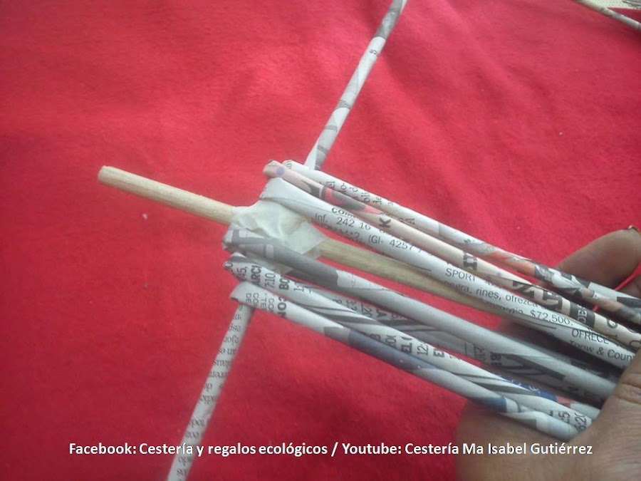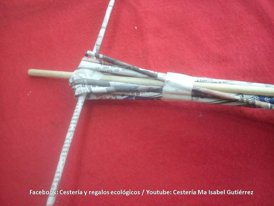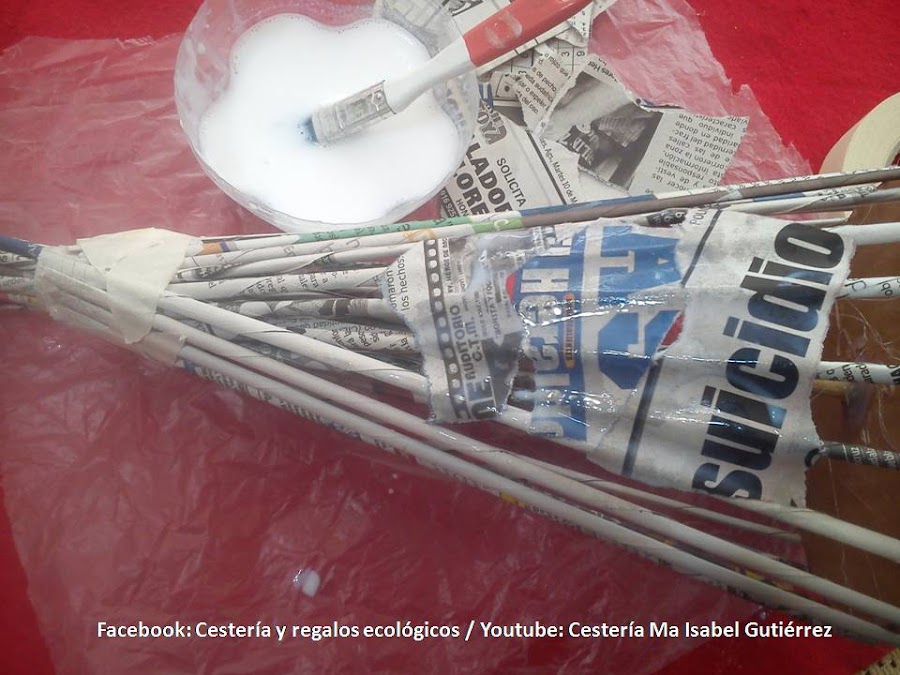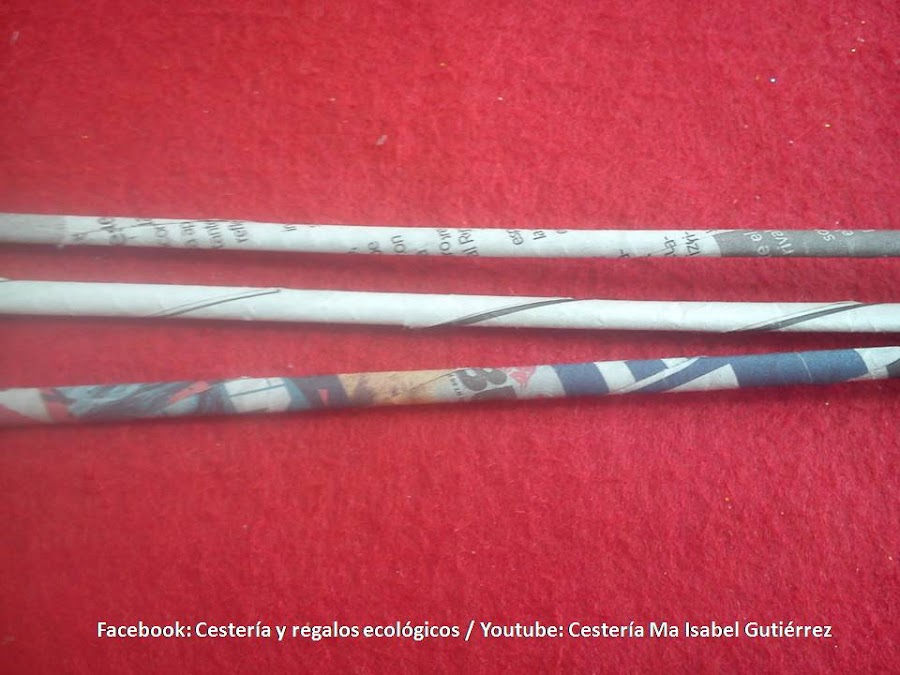 Necesitaremos varillas de papel, las hacemos cortando tiras de papel de diario de aproximadamente 7 cms., de ancho y cortadas a lo alto del periódico, ponemos pegamento o cola en toda una orilla y por la orilla contraria, en la esquina, acomodamos un palillo delgado o una aguja de tejer y vamos enrollando... retiramos el palillo y queda lista la varilla de papel, necesitaremos aproximadamente 30 varillas de papel...