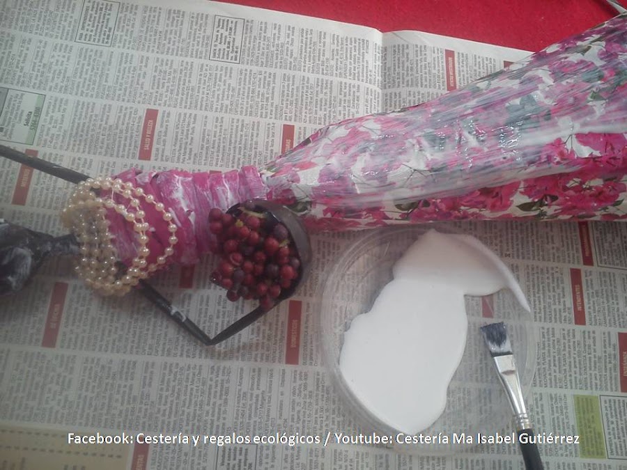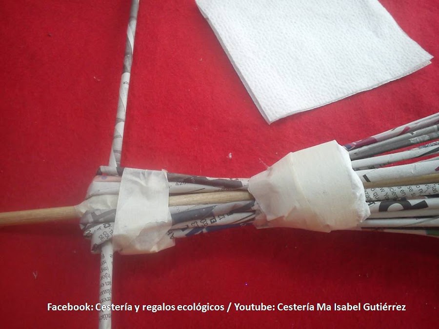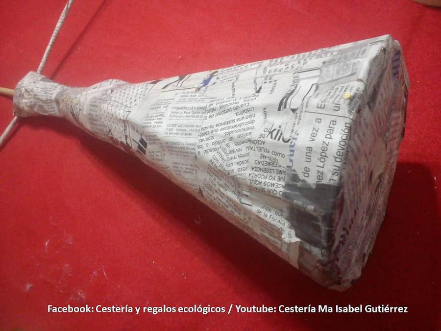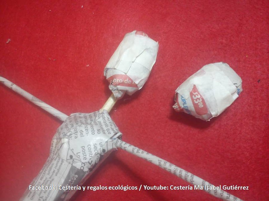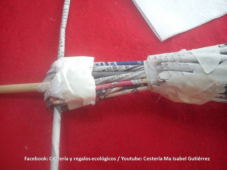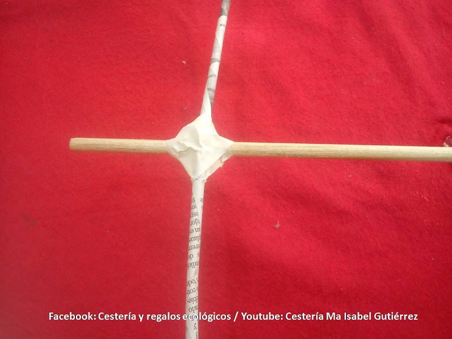 Necesitaremos varillas de papel, las hacemos cortando tiras de papel de diario de aproximadamente 7 cms., de ancho y cortadas a lo alto del periódico, ponemos pegamento o cola en toda una orilla y por la orilla contraria, en la esquina, acomodamos un palillo delgado o una aguja de tejer y vamos enrollando... retiramos el palillo y queda lista la varilla de papel, necesitaremos aproximadamente 30 varillas de papel...