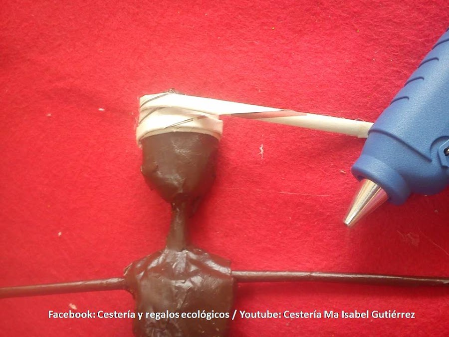 Aplicamos silicón y vamos enrollando la varilla de papel alrededor de la cabeza...