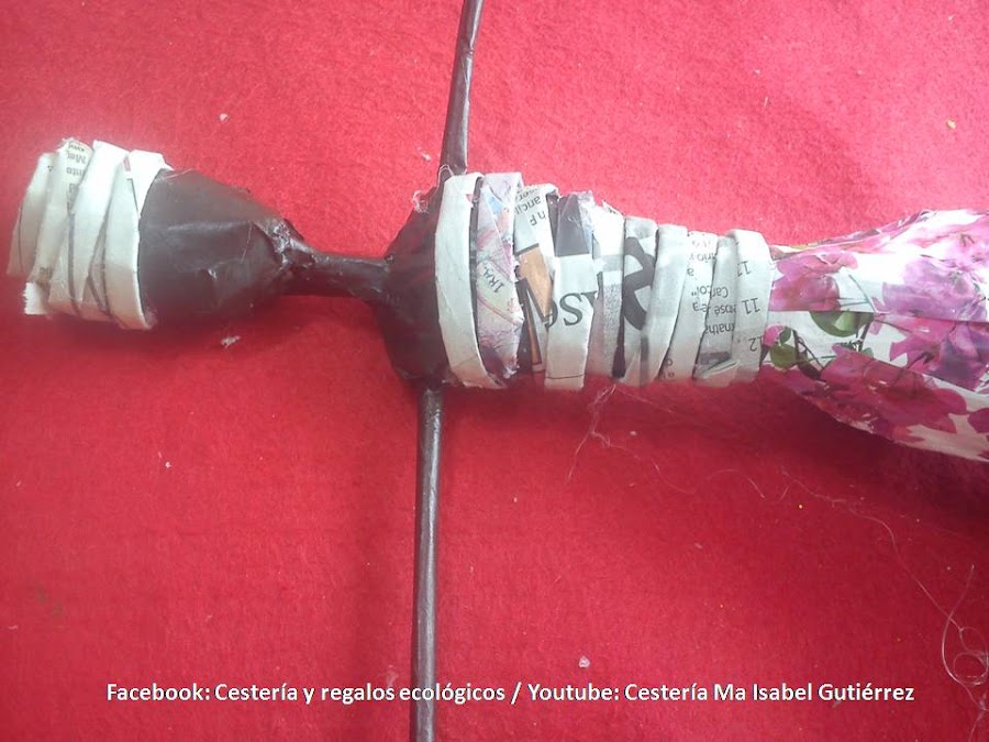 Empezamos por formar el torso de la africana, Tomamos una varilla de papel y la pegamos, por la parte media, aproximadamente 6 cms., hacia abajo del extremo de la varilla, podemos pegar con silicón o con cinta de papel, éstos serán los brazos y lo que queda de la varilla hacia arriba, será el área donde haremos el cuello y la cabeza...