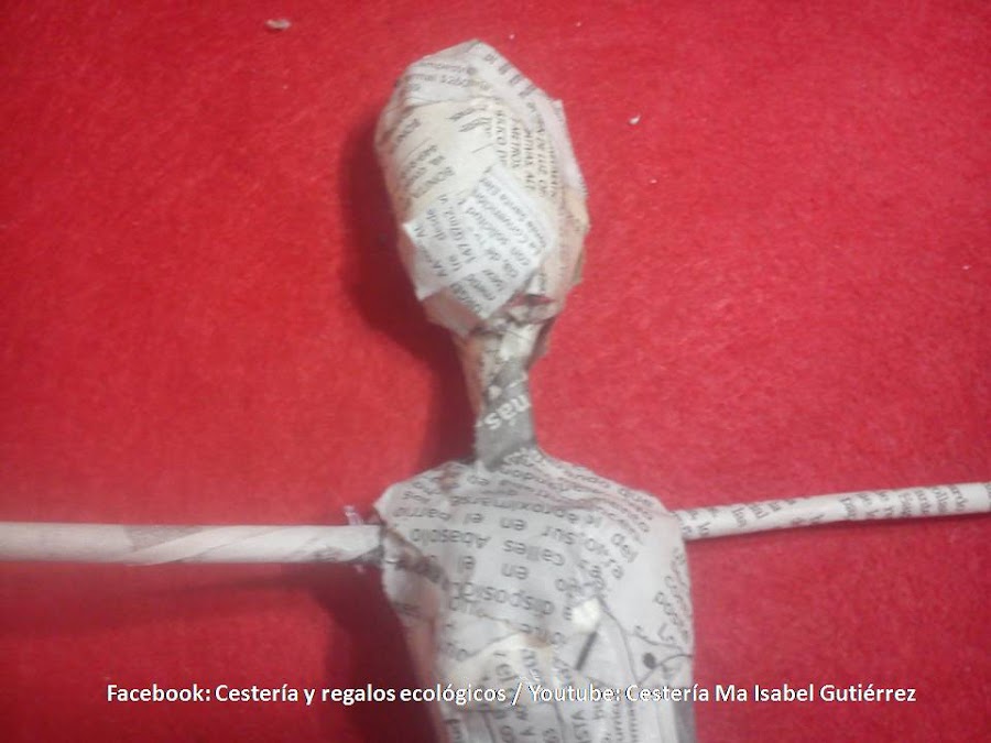 Formamos la cabeza moldeando pedazos de papel en forma de óvalo, tratando que la parte delantera del rostro quede lisa, por atrás podemos presionar el papel para darle forma y pegamos alrededor cinta de papel para que no se deforme, luego, vamos a pegar al extremo del palo de madera con silicón caliente...