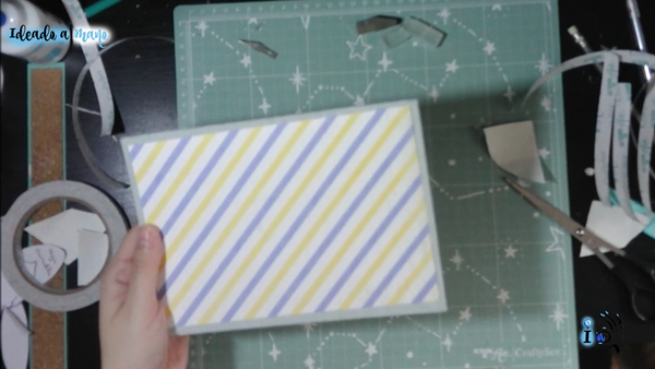 En la parte trasera vamos a colocar una goma para poder cerrar nuestra agenda y llevarla mejor en el bolso o mochila, o poder meter papeles dentro... Para eso, antes de cerrar las solapas, hacemos unos cortes en el cartón por los que metemos la goma y luego la pegamos al cartón con cola blanca.