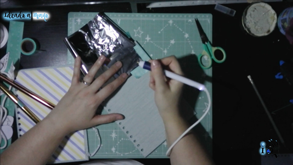 Una vez hechos los agujeros y antes de colocar la anilla voy a darle otro toque a la tapa, y es que utilizando foil termosensible y una pluma de calor le voy a colocar en la tapa, en plateado, el año.