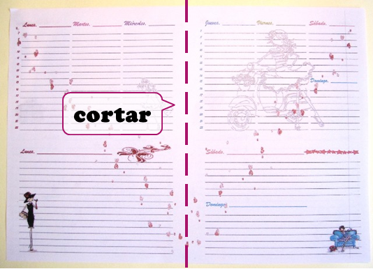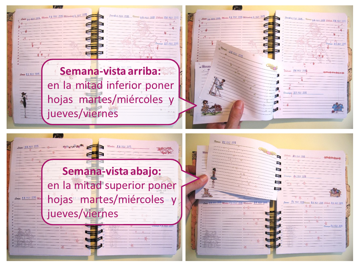 Por un lado os tiene que quedar la hoja con la semana-vista arriba (abajo estará la parte día-vista, a la izquierda el lunes y a la derecha el sábado y el domingo) y por el otro la hoja con la semana-vista abajo (arriba os quedará el día-vista, a la izquierda el lunes y a la derecha el sábado y el domingo).