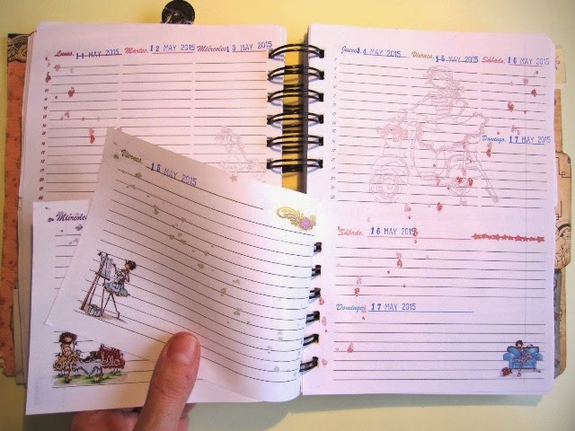 Como podéis ver la hoja se divide en dos partes: la superior en la que está el sistema semana vista y la inferior en la que está el día de la semana en varias hojas. Así con la agenda abierta en una semana dada, sólo tenéis que ir pasando las medias-páginas inferiores para escribir lo que queráis en el día correspondiente.