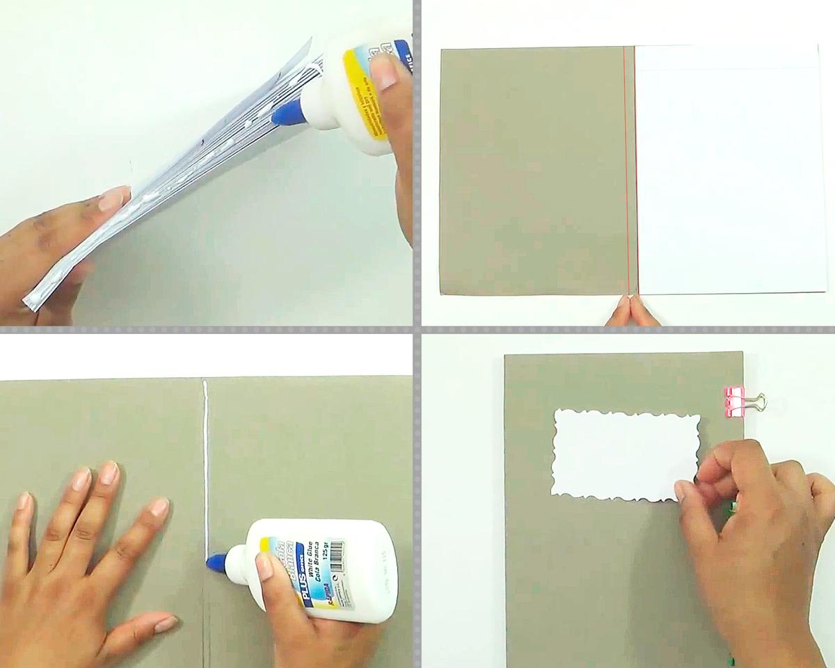 Cuando tengas todas las páginas trazadas, juntalas y pon pegamento en el lomo, fíjalas con pinzas hasta que el pegamento seque.
