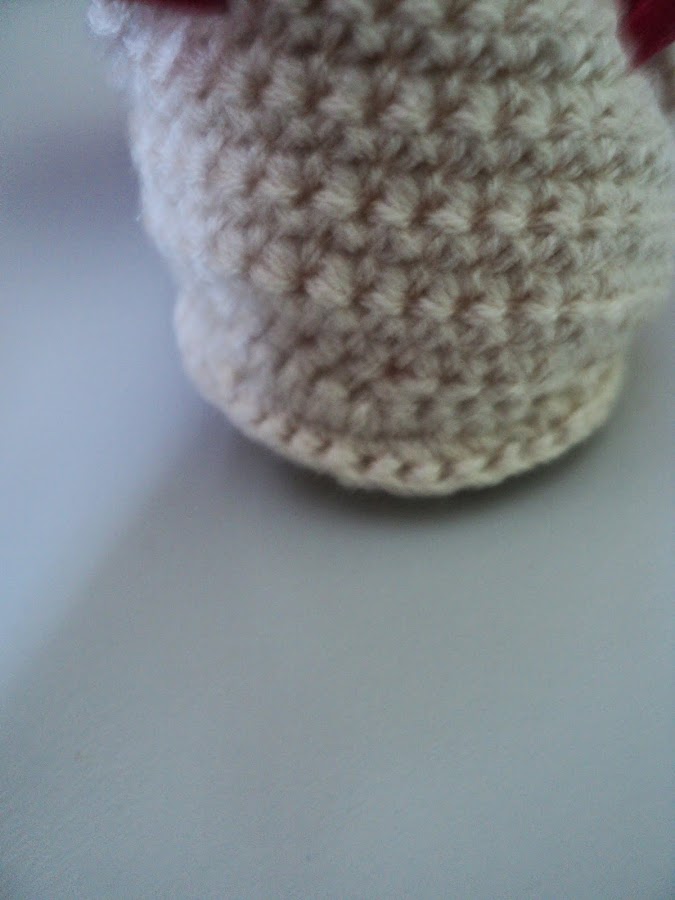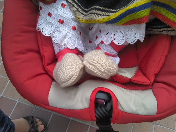Para hacer la suela seguí las instrucciones del gráfico de la Sra. Esperanza Rosas en su página "Tejiendo Perú", pero para la parte del talón y la puntera fui utilizando la técnica del "hacer y deshacer". Descarte las suelas de esparto que tenía porque la nena apenas tiene cuatro meses y medio y no quería que se sintiera incomoda por el peso y la rigidez de la suela.