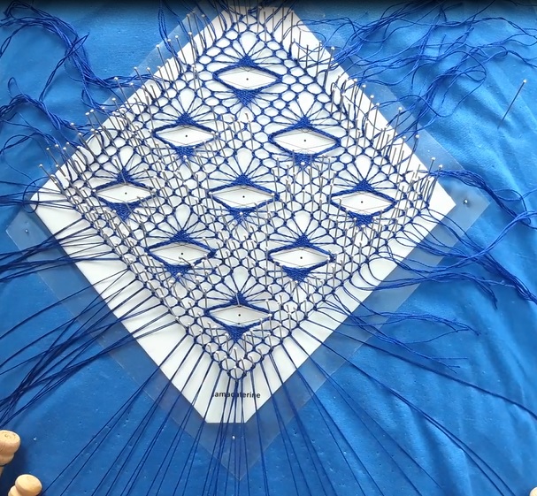 Al mismo tiempo aprovecho para hacer un tipo nuevo de araña o milano (punto de la técnica de encaje de bolillos tradicional o de torchon) cuya forma me recuerda a un ojo, y así la he bautizado para poder diferenciarla de otros modelos, porque modelos hay... muchísimos.