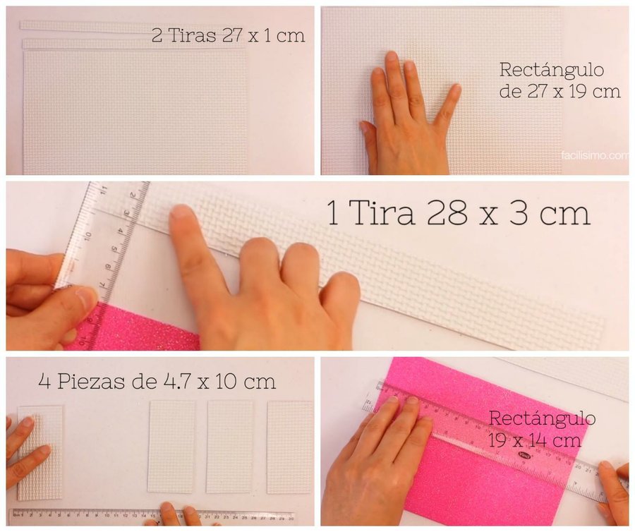 Antes de ponerse manos a la obra con el bolso, se debe preparar las piezas de goma eva. Hay que cortar la cantidad de tiras y rectángulos con las medidas que se indican en la siguiente imagen. ¡No te olvides de ninguna! En total debes de tener 9 piezas.