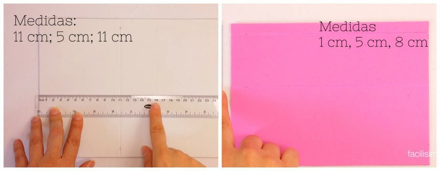 En los dos rectángulos grandes, debes hacer unas marcas en la parte posterior. En el de 27x19 cm., marca con un punzón una línea a los 11 cm., 5 cm. y 11 cm. En el otro rectángulo (de 19x14 cm.), hay que hacerlo a la distancia de 1 cm., 5 cm. y 8 cm.