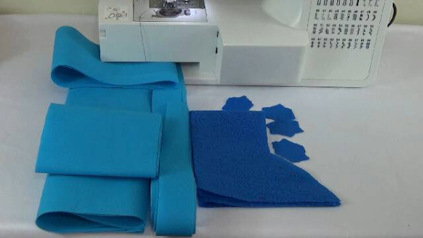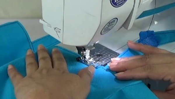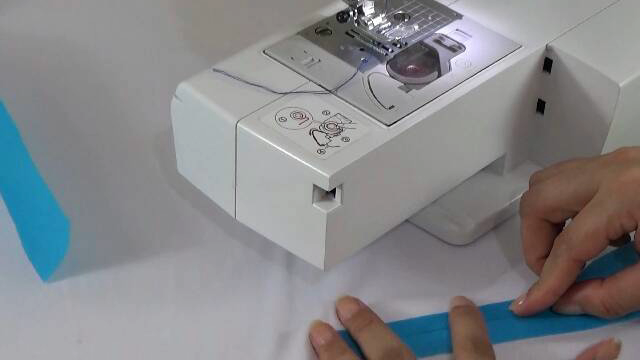 9. Preparar las asas, debemos doblar al centro dos veces hasta obtener una cinta de 2.5cm, seguidamente pasamos una costura a los lados de 0.5cm.,si le van a colocar algún adorno este es el momento.