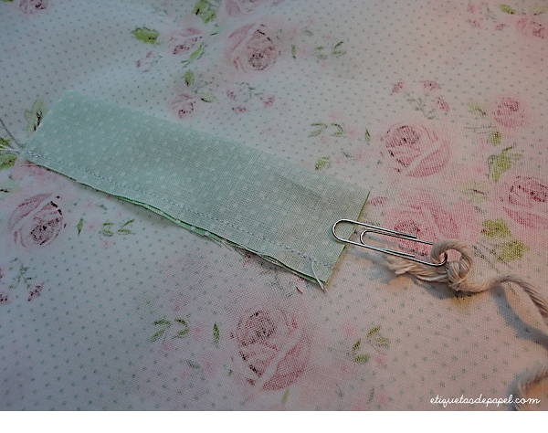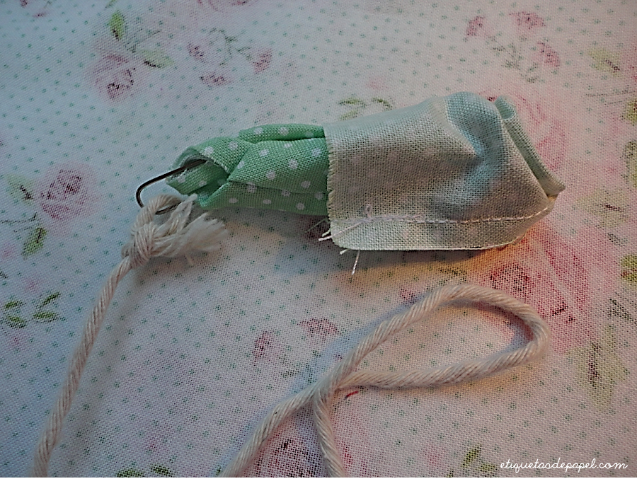 Para darle la vuelta a la pieza he utilizado un clip de los que se usan en papelería y un trocito de cuerda que tenía por casa. Lo pondremos sobre un extremo con nuestra cuerda bien atada para que no se nos escape el clip e iremos tirando de la cuerda poco a poco ayudándonos con las manos. Una vez dada la vuelta, le pasaremos la plancha.