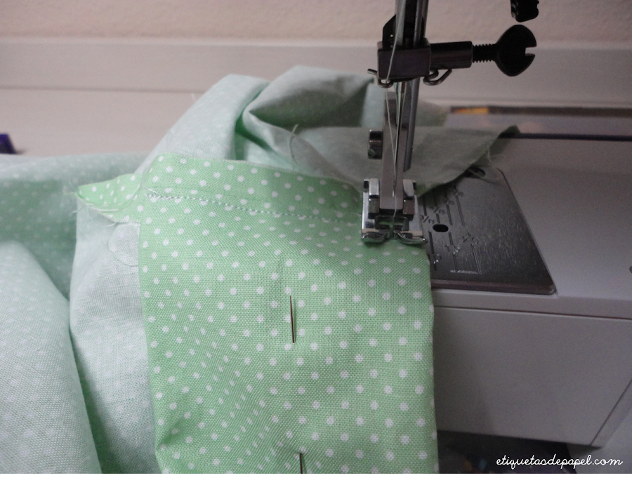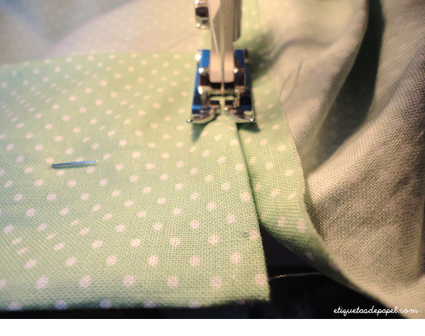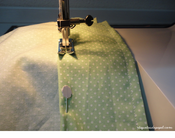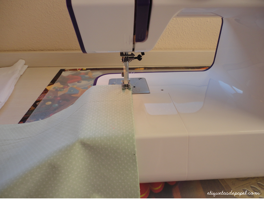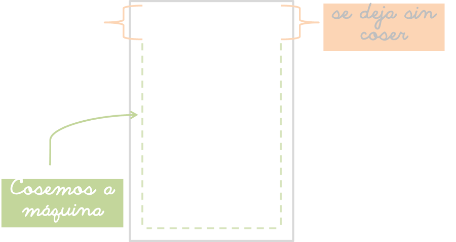 Comenzaríamos a coser en línea recta por la parte inferior del revés de la tela, hasta llegar a la parte donde os he puesto "se deja sin coser". Esta zona será la que después le daremos la vuelta para el dobladillo de arriba y a la misma vez nos servirá para introducir la cinta que cerrará nuestra bolsa.