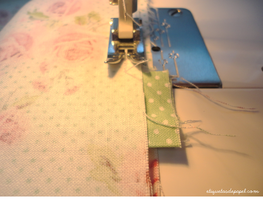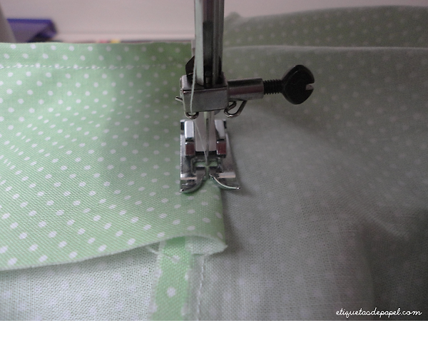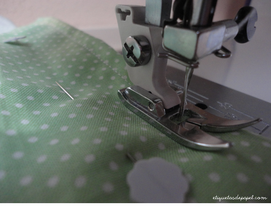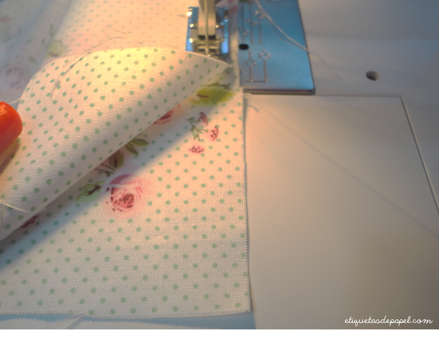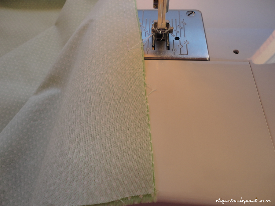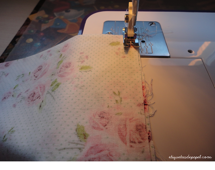 Coseremos una costura alrededor de nuestra tela exterior comprobando que podamos introducir nuestra cinta decorativa que nos servirá para cerrar la bolsa.