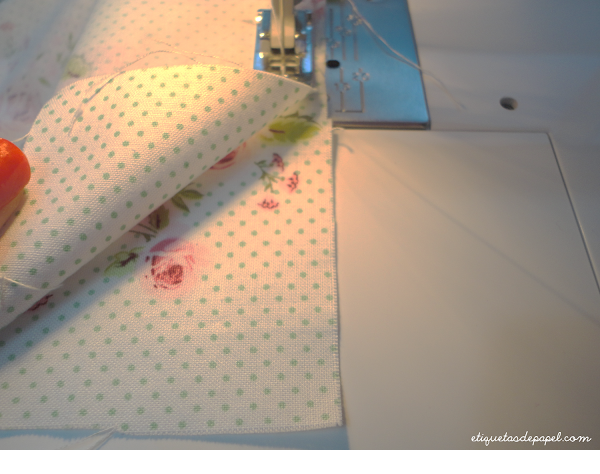 Coseremos una costura alrededor de nuestra tela exterior para que queden los bordes con un mejor acabado. Y en este momento le daremos la vuelta sólo a nuestra bolsa del exterior e introducimos la bolsita de topos dentro de la bolsa de flores.