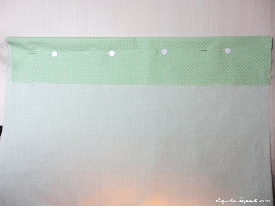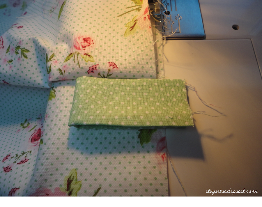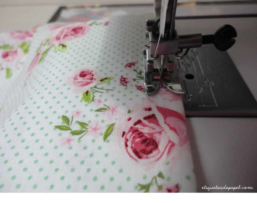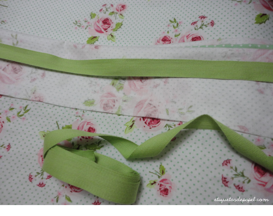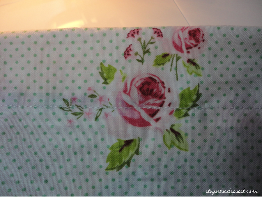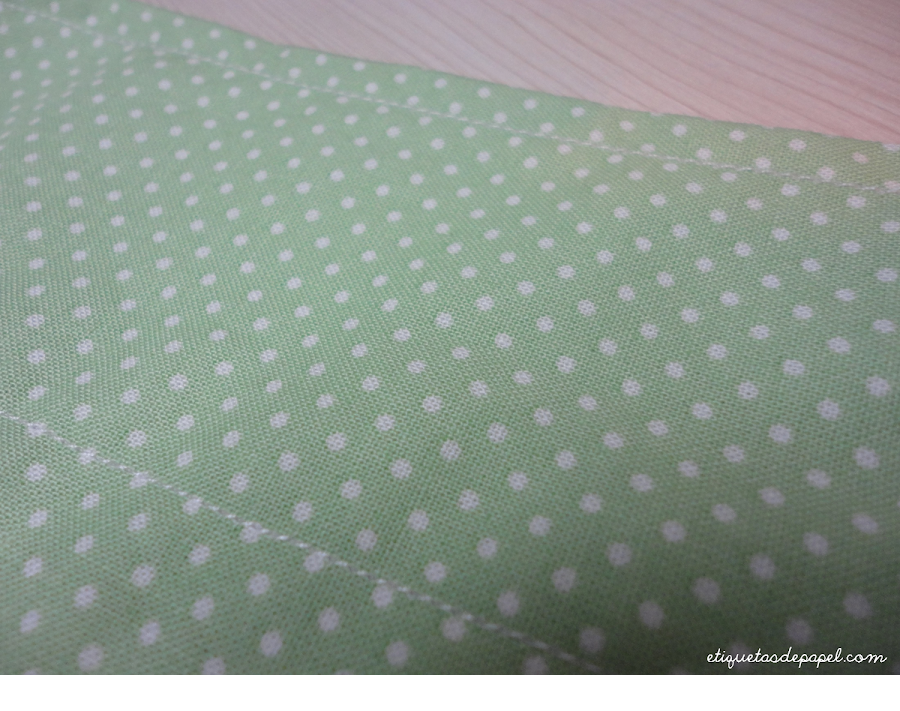 En mi caso la tela flores la he utilizado para el exterior y para el interior he elegido una verde mar con topos blancos. La marca de la tela es Guetermann.