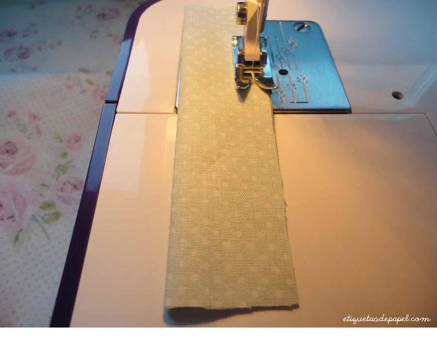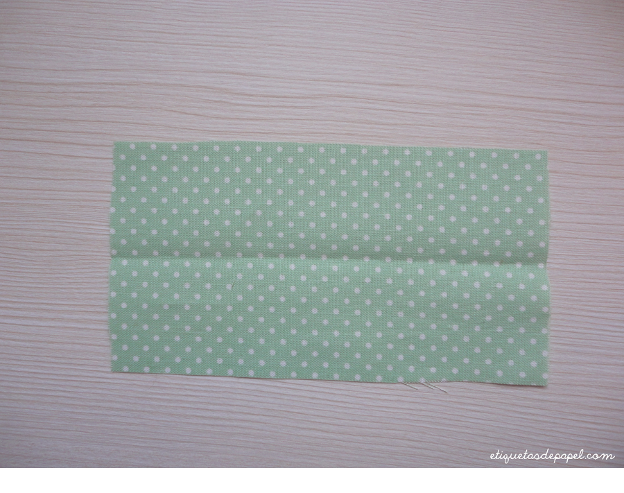 Ahora cortaremos un rectángulo de la misma tela que usaremos como forro (Medidas: 13 cm largo y 7 cm de ancho). Lo doblaremos por la mitad con los derechos enfrentados y coseremos el borde donde se juntan.