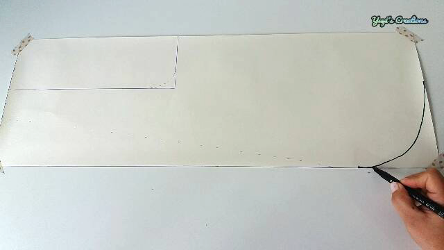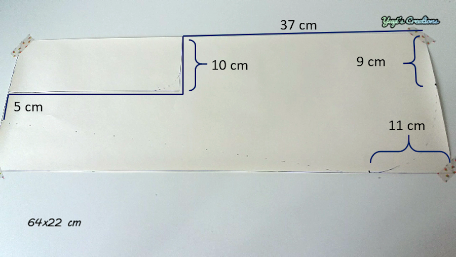 Comenzamos! Para sacar el patrón vamos a empezar dibujando en un trozo de papel un rectángulo de 64x22 cm, luego hacemos una marca a los 9 cm hacia abajo, partiendo de la esquina superior derecha y otra marca a los 11 cm hacia la izquierda partiendo de la esquina inferior derecha.