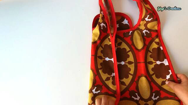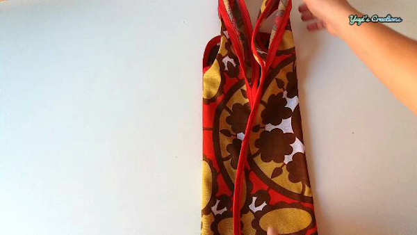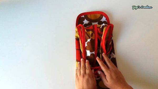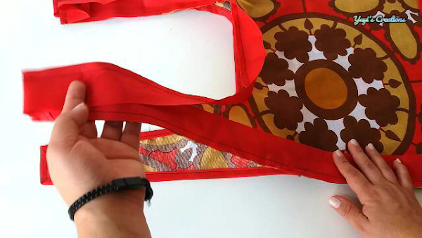 Ahora vamos a armar la bolsa, vamos primero colocarle el bies o la cinta que hayas elegido a una de las piezas del bolso, solo se lo colocaremos desde un poco más abajo de la línea de la abertura de la bolsa y alrededor de las asas, y también cosemos un trocito de bies.