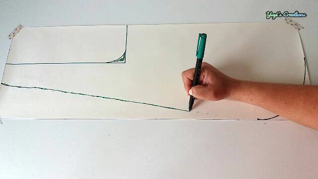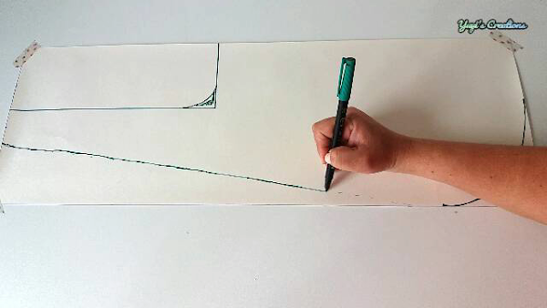 Ahora para hacer las asas, vamos a partir de la línea de los 5 cm que hicimos y que puedes ver en la imagen 1. Vamos a ir bajando poco a poco a medida que ensanchamos el asa hasta formar el contorno del bolso. El patrón te debe quedar de la siguiente manera: