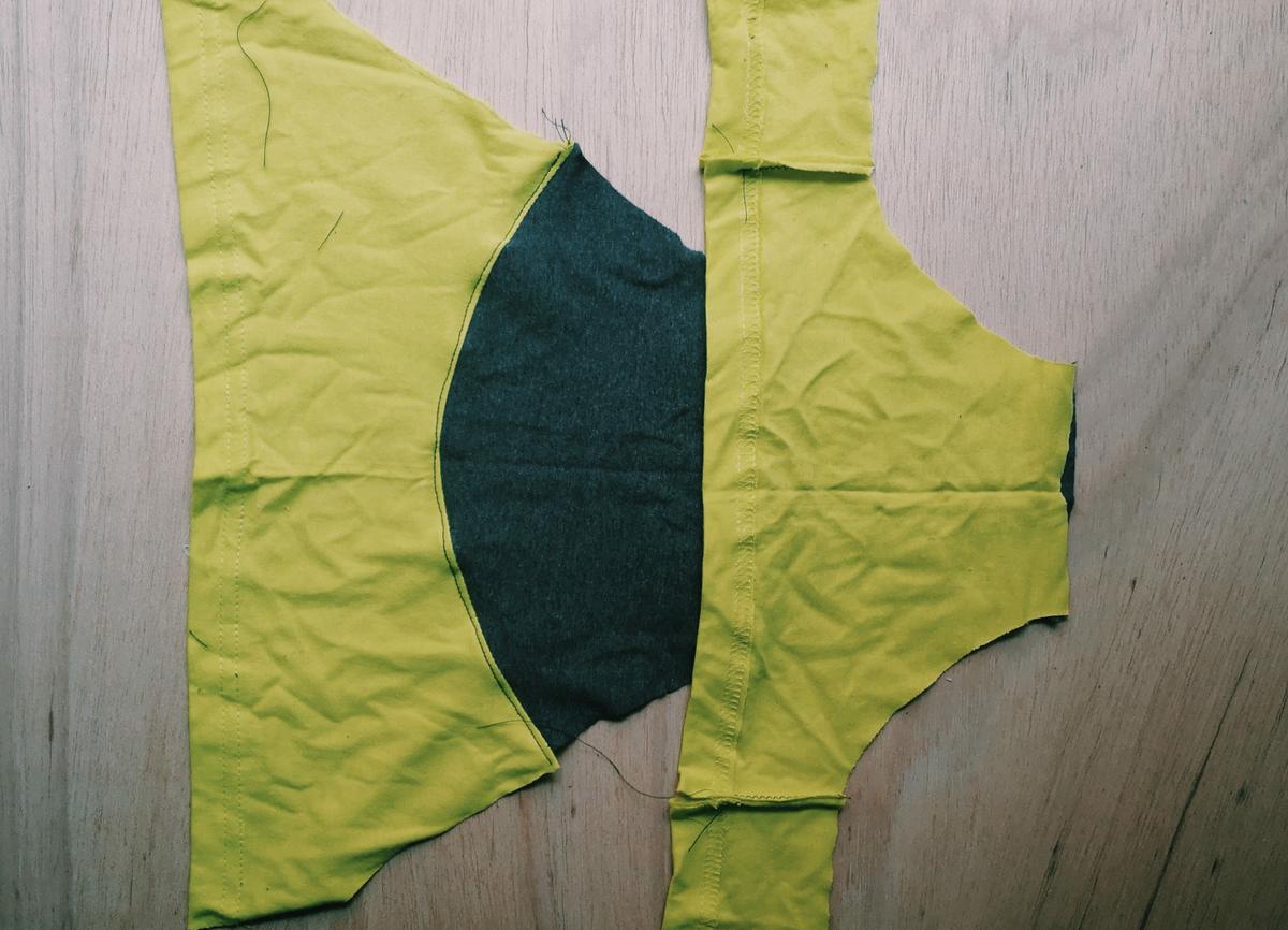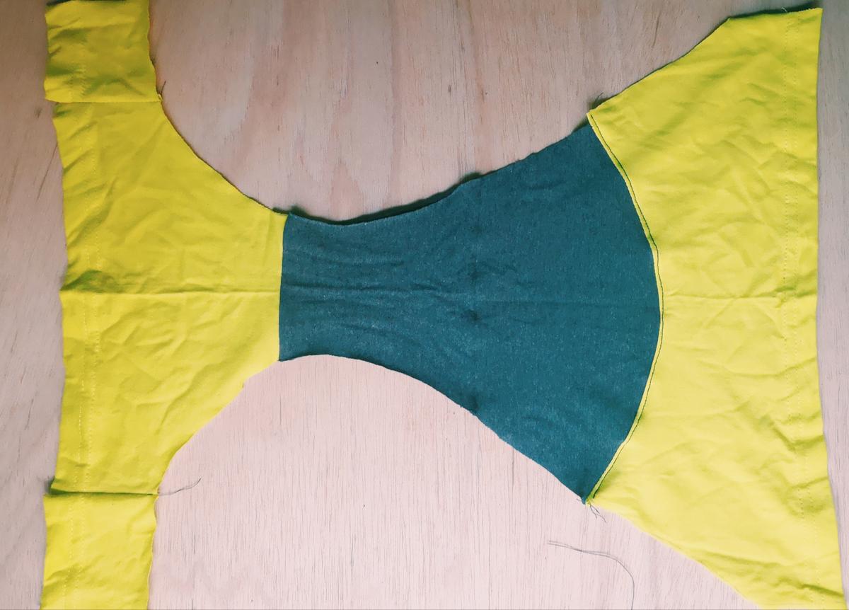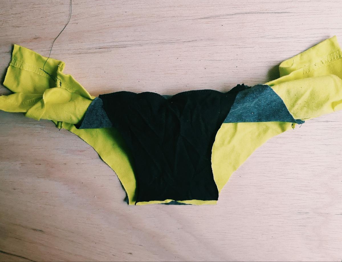 Pieza trasera de la braguita formada por la tela de dos mangas diferentes Para coser la braguita lo primero que haremos será colocar las dos piezas centrales formando una especie de sandwich con la pieza central de forma que al coserlo no se vea la costura ni por fuera ni por dentro.