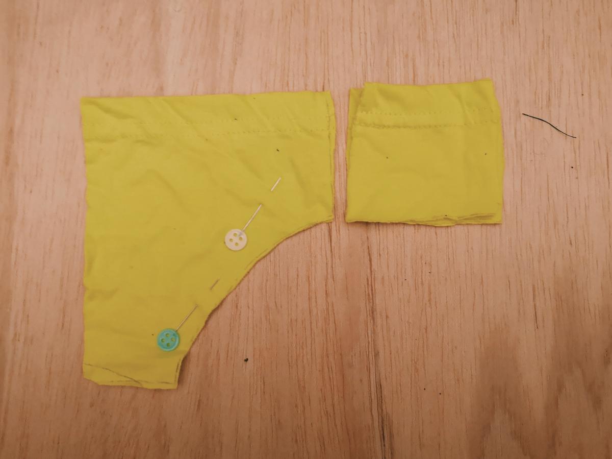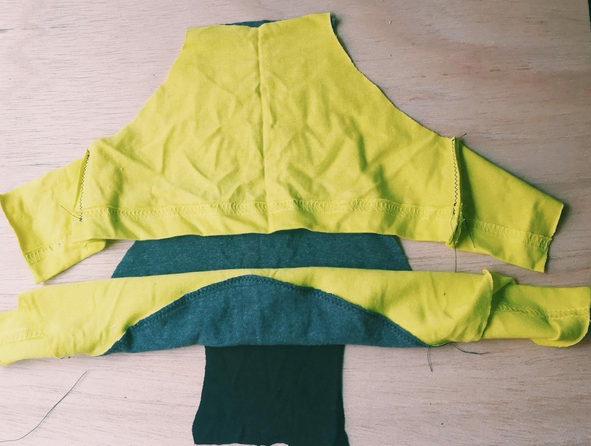 Una vez planteado el diseño de la braguita cortaremos las piezas necesarias. En la foto podéis ver cómo he necesitado dos mangas de diferentes camisetas para hacer el trasero de la braguita.
