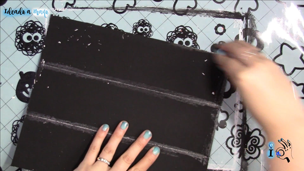En la parte de arriba de la tapa en este caso voy a usar unos chipboards de madera que he pintado de negro y pego con cola de carpintero a la tapa.