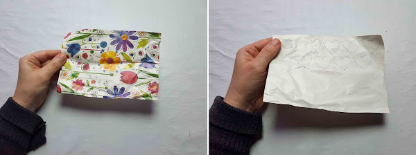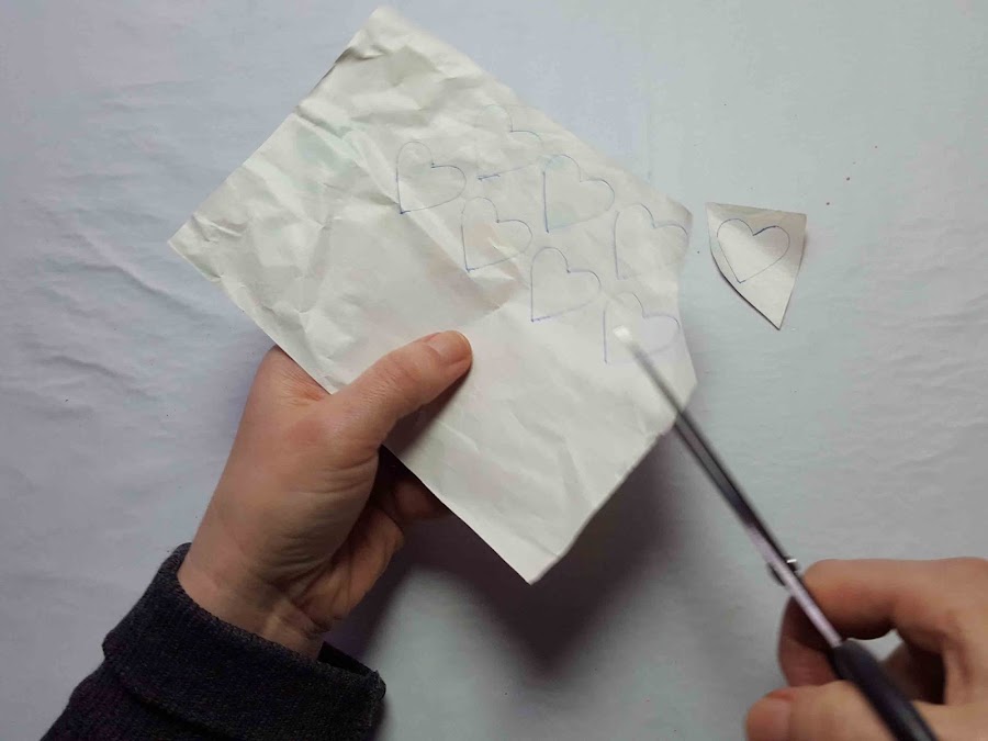 Por la parte de atrás del papel de regalo se hacen unos corazones con la plantilla del corazón y se recortan.