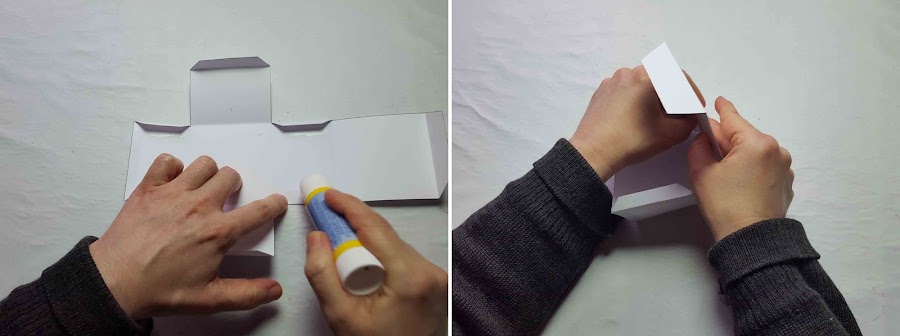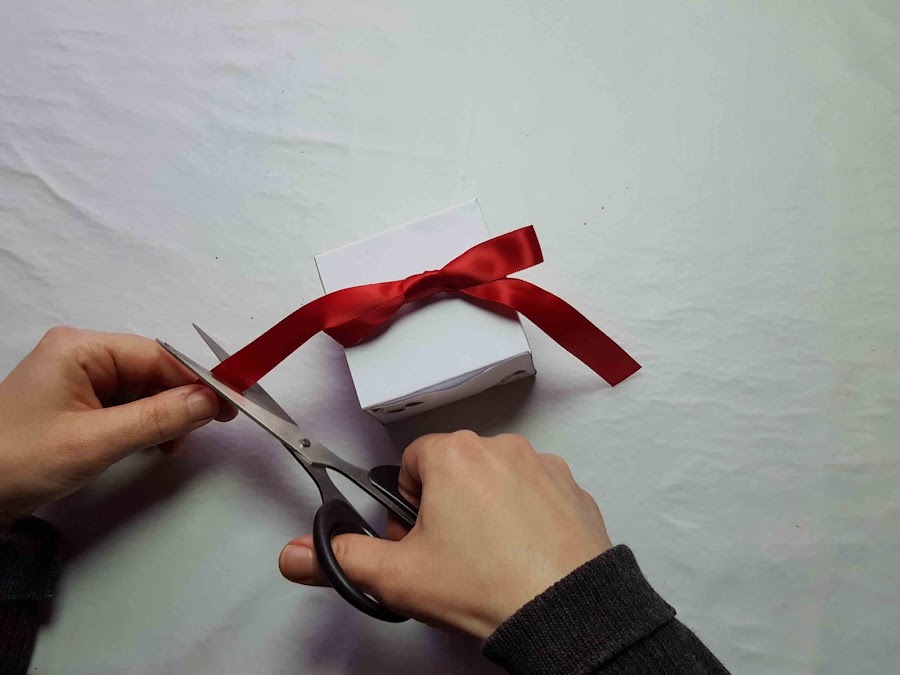 Se pegan los corazones a la caja, se guarda el regalito y se ata con una cinta.