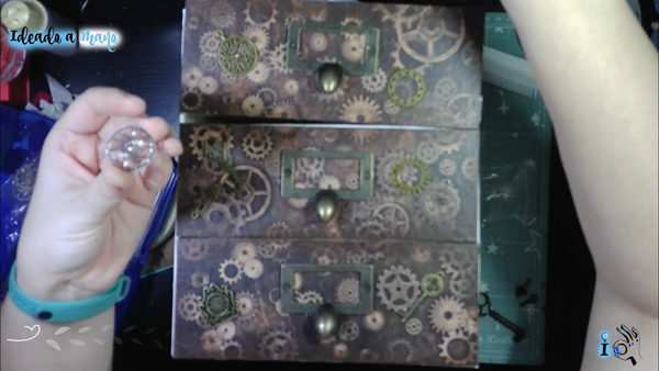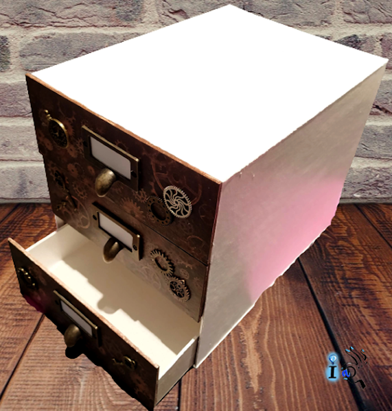 Al final del todo yo he acabado de decorarla pegando con pegamento instantáneo algunas piezas metálicas que también tienen un aire Steam Punk. Pero por supuesto vosotros podéis decorar vuestra cajonera como os guste.