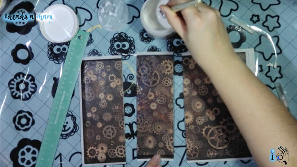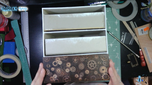 Los frontales de los cajones los voy a decorar con papel de arroz, en mi caso con este papel de engranajes que le da un aire Steam Punk que ya sabéis que me encanta. Para que el dibujo quede continuo pego las tres piezas del frontal sobre el papel entero, separándolas entre sí como 1mm, y luego es cuándo corto con un bisturí muy afilado entre las piezas, cuándo el papel está todavía seco. Luego pondré la capa de cola de decoupage por encima para proteger. Cuándo está seco vamos a retirar el sobrante del papel utilizando una lija de grano fino o una lima de uñas. Luego le damos un toque envejecido manchando como a pincel seco con pintura acrílica marrón chocolate por los bordes de cada frontal. Esto también se podría hacer con tinta, pero como luego yo lo voy a barnizar con un barniz mate al agua, y al ser al agua es probable que se lleve la tinta que también es al agua, prefiero hacerlo con pintura.