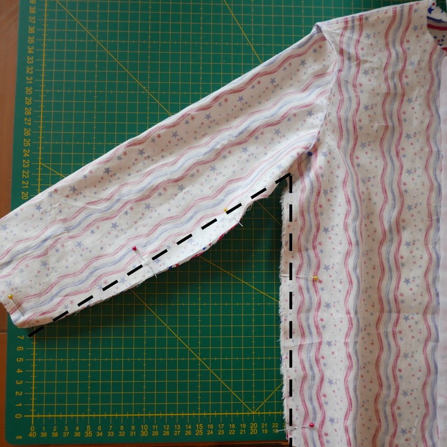 Para hacerlo tendremos en cuenta los piquetes que hemos marcado en las piezas. Recordar que la mitad de la manga, según el modelo, debe coincidir con la costura del canesú y el delantero.