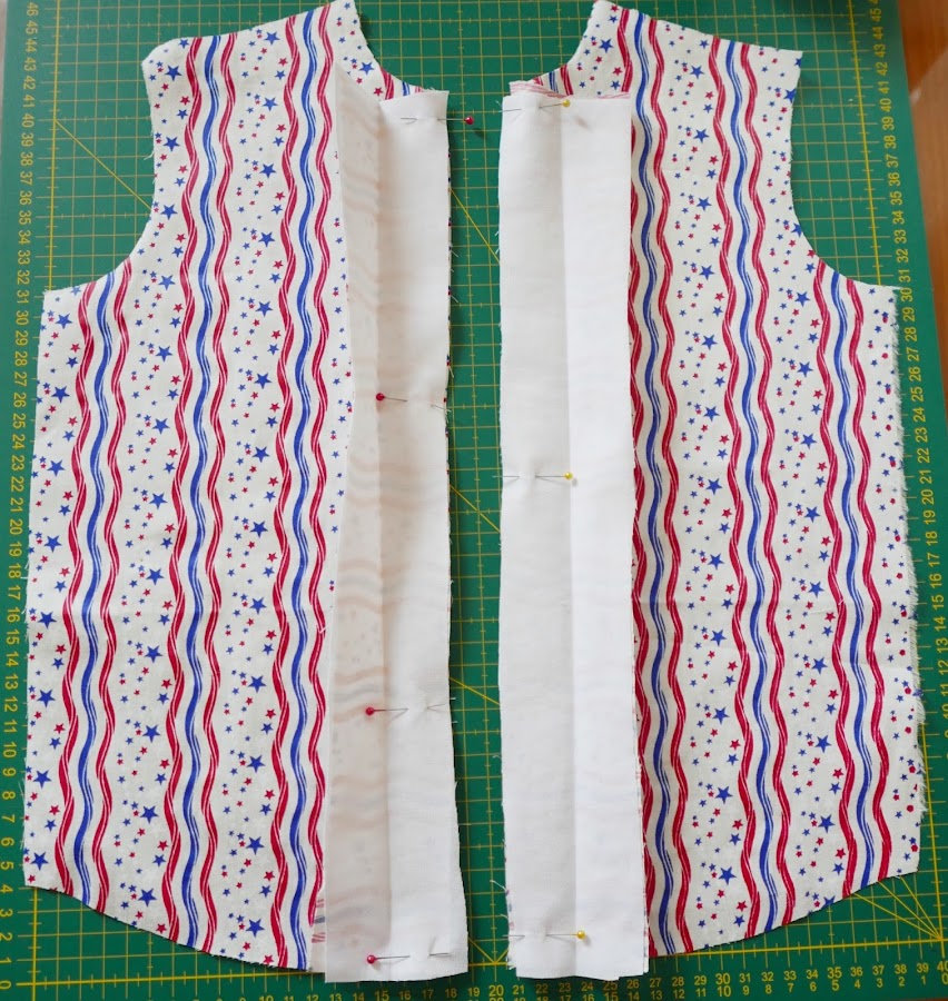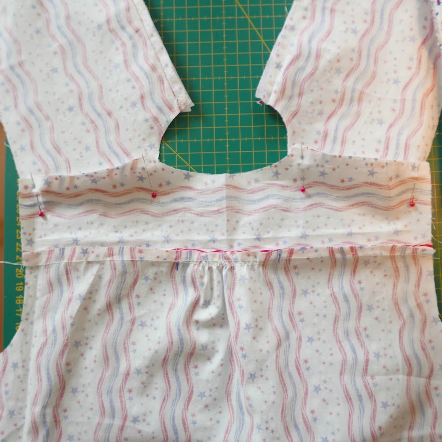 Luego colocamos el canesú con las marcas que aparecen en el patrón y que deben coincidir. Después uniremos la espalda con el canesú: