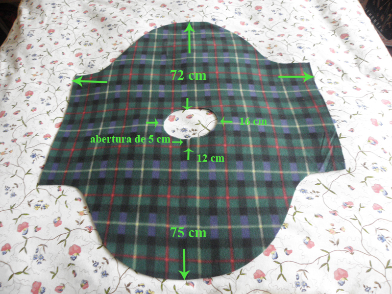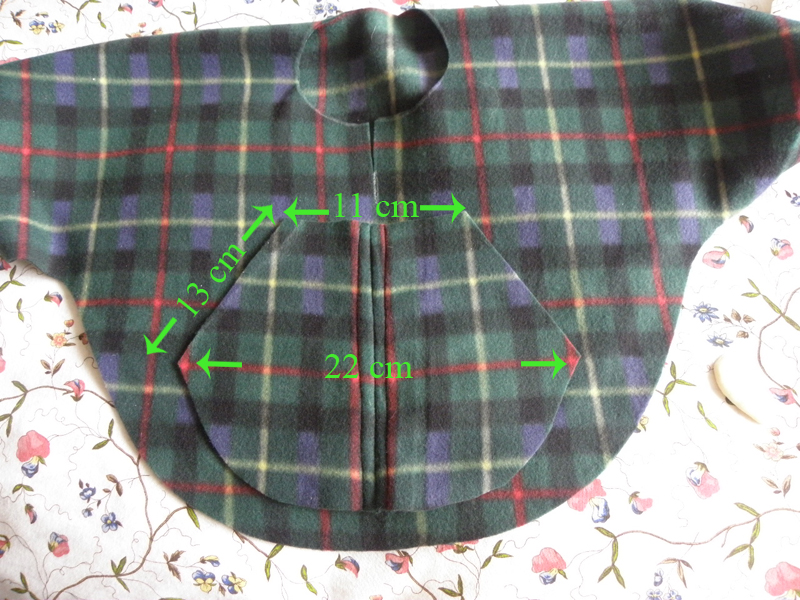 Las medidas del cuerpo de la capa. Para que sea más cómoda de meter por la cabecita del niño hacer una abertura de 5 cm en la parte central del cuello, en la que al final pondremos un cierre con un botón y una presilla de la misma tela