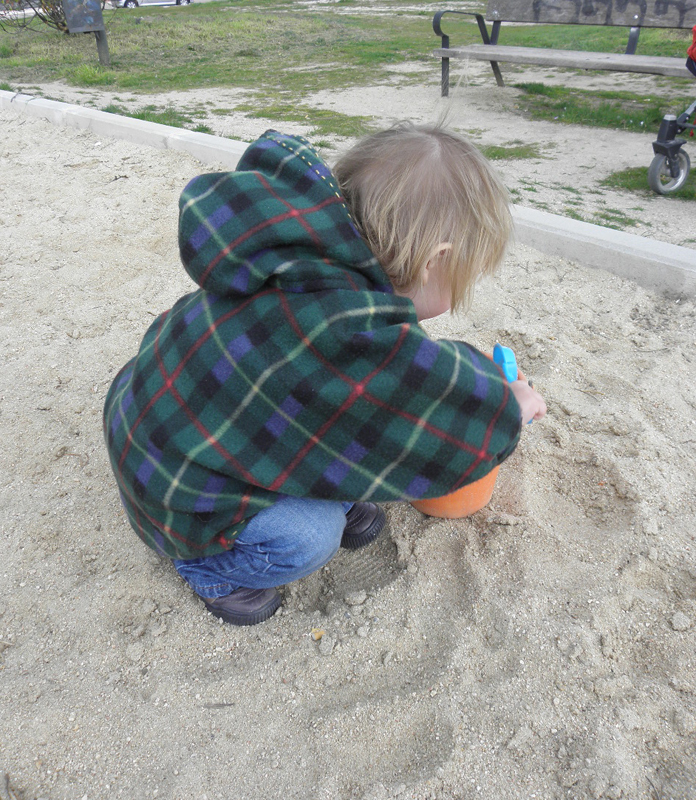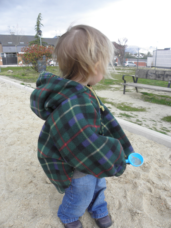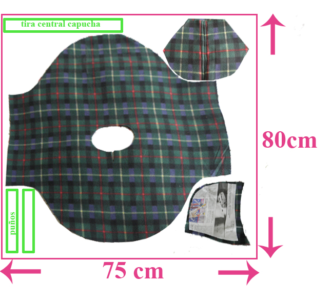 Con 80 cm de tela de doble ancho podemos hacer esta capa sencilla con casi ninguna costura, rápida y además ¡nos salen dos!. Yo he usado una tela acrílica, la típica de las mantas de sofá, para su confección. Es una tela que no necesita remate en las orillas, ya que no se deshilacha. Eso sí para que resulte cómoda y no tener problemas con la piel del niño, he forrado la capucha con algodón de una camiseta ya usada.