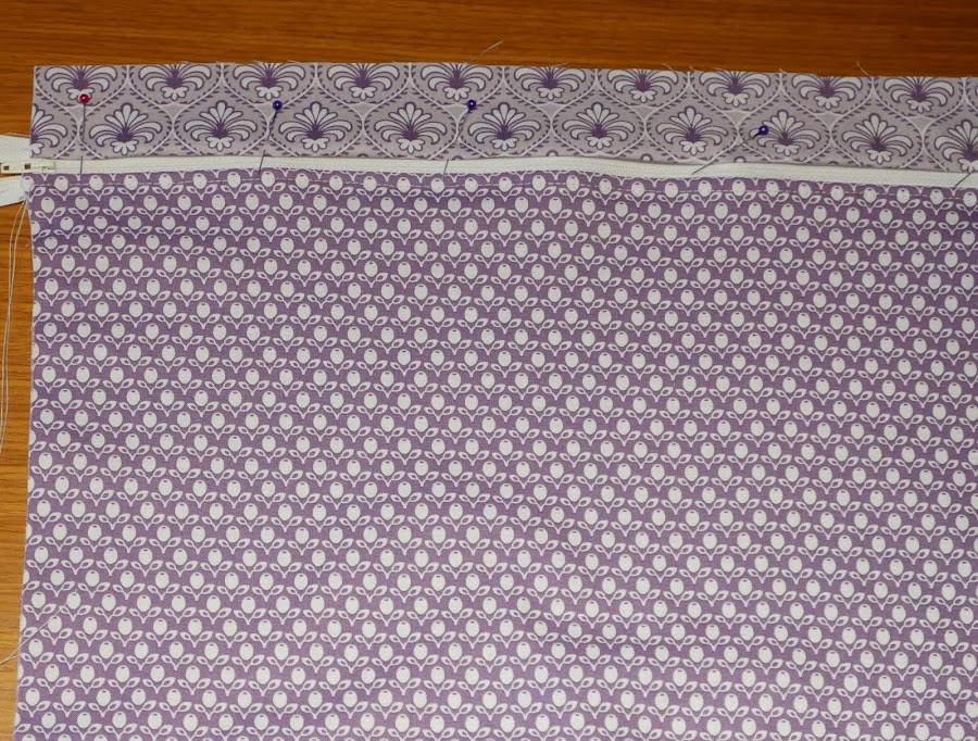 2. Así,colocamos la cremallera con alfileres en el rectángulo grande interior pieza interior de la carpeta (en el lado superior).